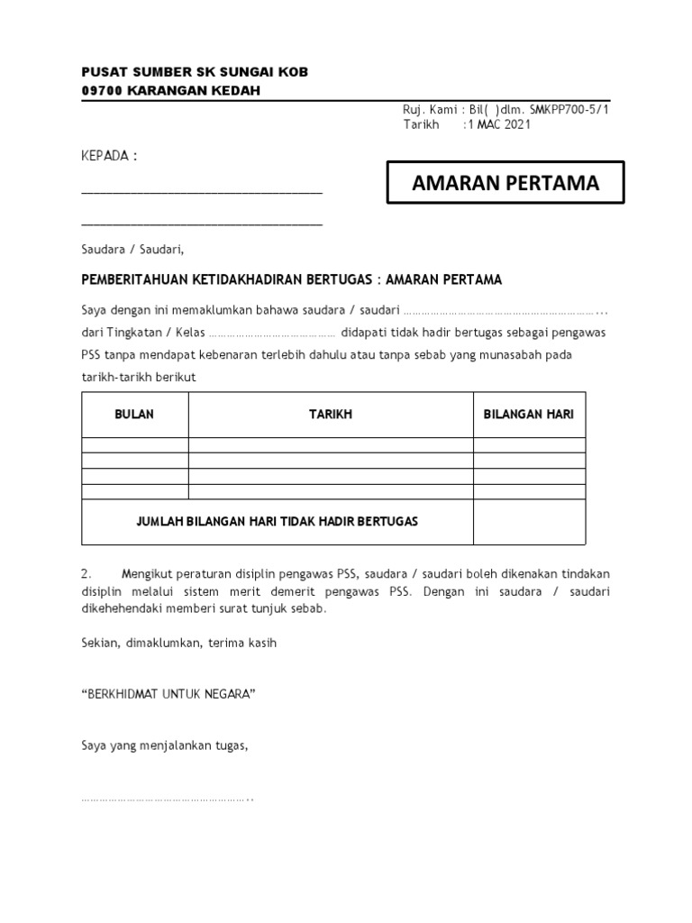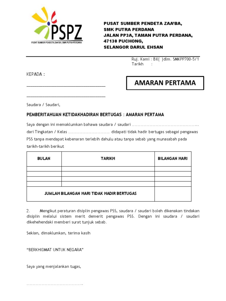 Kumpulan gambar contoh surat amaran tidak hadir bertugas terlengkap 2019. Sila hantar surat tersebut juga untuk pelajar yang telah ditandai p sebanyak 40. Surat amaran tidak hadir bertugas.